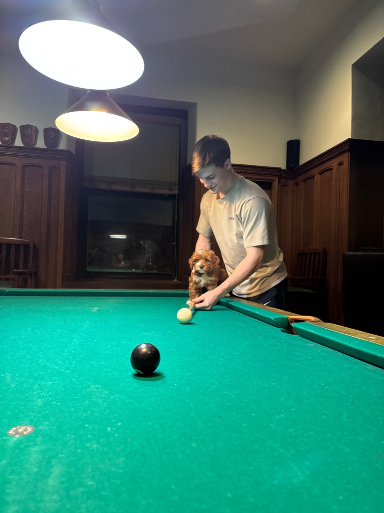 Toby, our newest (and arguably most popular) Cannon regular, is a three-month-old Australian labradoodle puppy belonging to Abbie Lee ’26 🥹. Genuinely, he might be the cutest, sweetest dog in the world. Toby has quickly made himself at home around the club whether he’s bouncing from room to room, greeting members like old friends, or even playing pool! He brings a smile to everyone’s face and brightens the club like no other. We are so grateful to have him around and are excited to watch him grow.